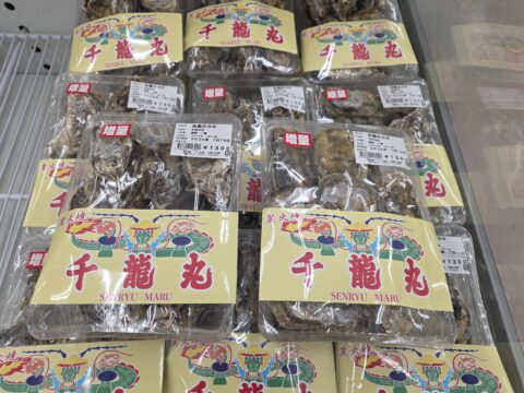 地元漁師手造りの干し魚や塩ワカメ、ところ天など磯の香のする海産加工品の数々。博多もずくやふのりなどの海藻類もあります。