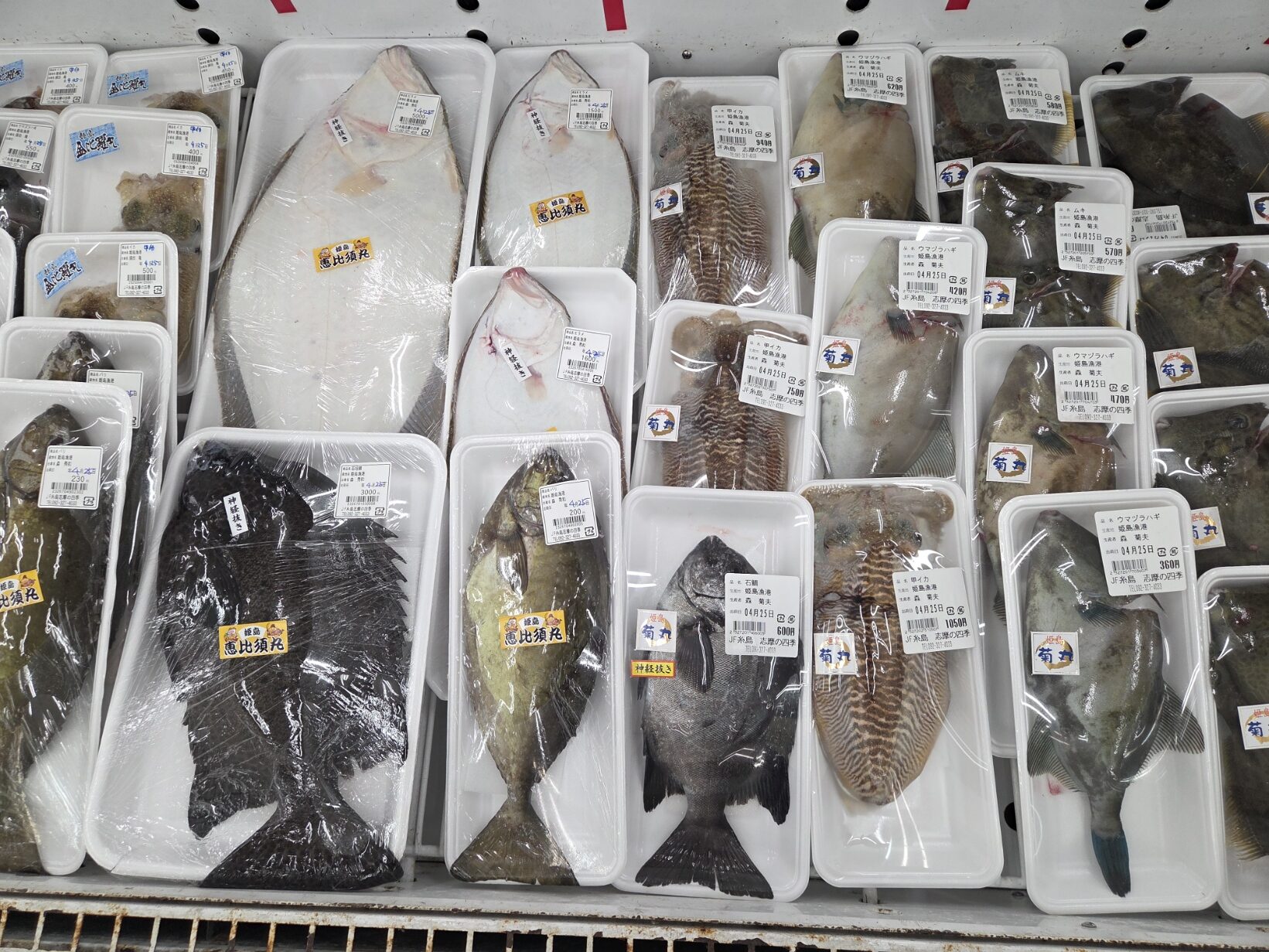 イサキ、真鯛、ヒラメ、ウマズラハギ、カワハギ、アコウ、黒鯛、アラカブ、サンノジ、紋甲イカ、コウイカ、サザエ、カキ、ふともずく等